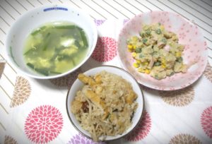 中は早い旬を迎えた剥きあさり(237円)の炊き込みご飯です。えのきだけ(138円)刻み揚げ・冷凍庫に残っていたニンジンとインゲン豆が追加の具材です。麺つゆで味つけてます。