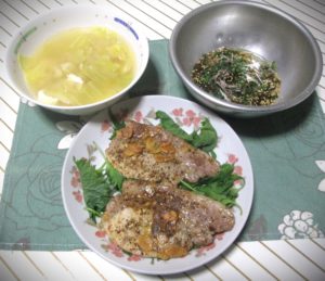 左は昨日の残りで、キャベツと豆腐の味噌汁です。