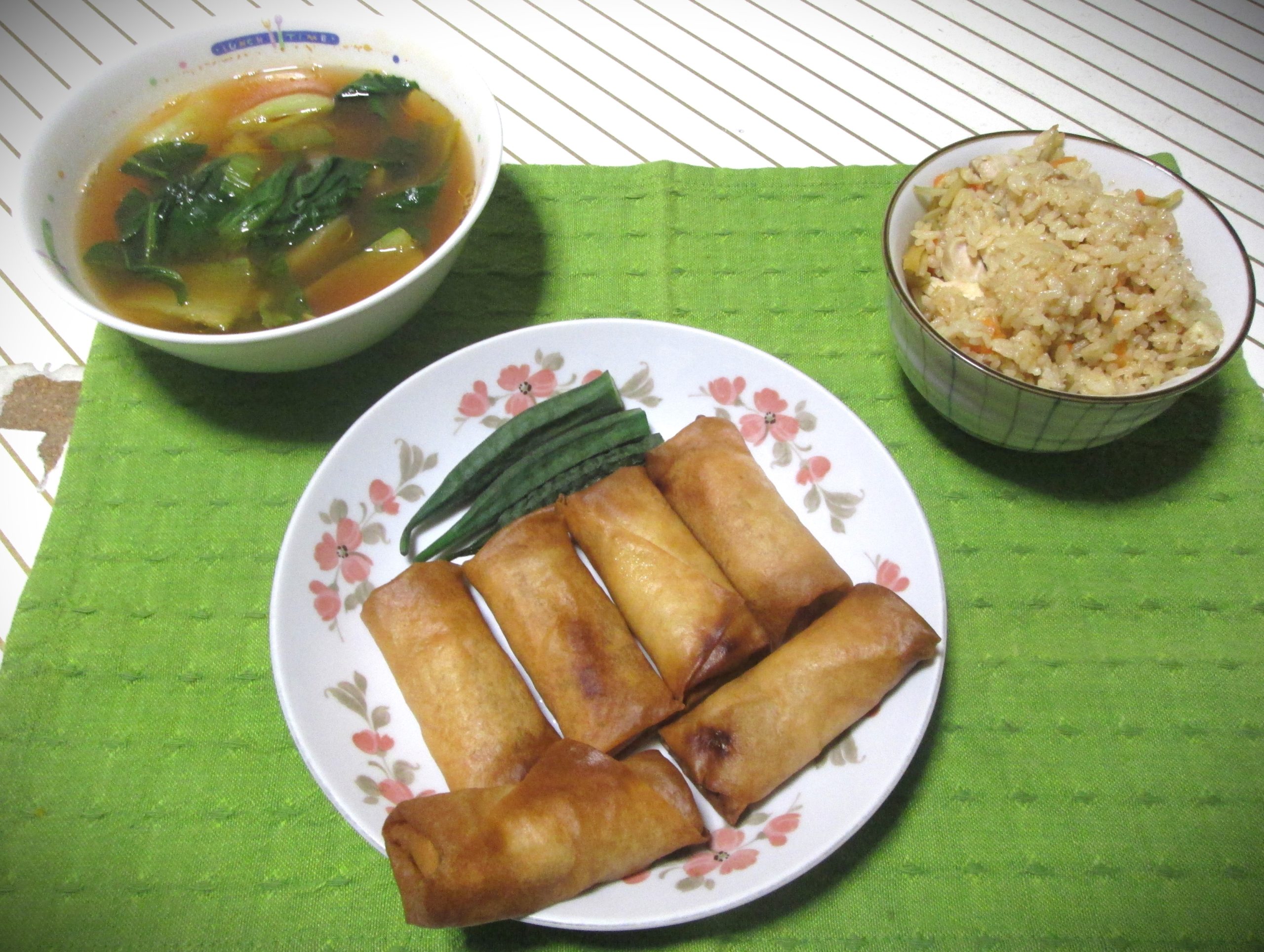 中は3月7日(土)に作った冷凍春巻きを揚げたものの残りです。おくら(98円)をレンチンで添えてます。