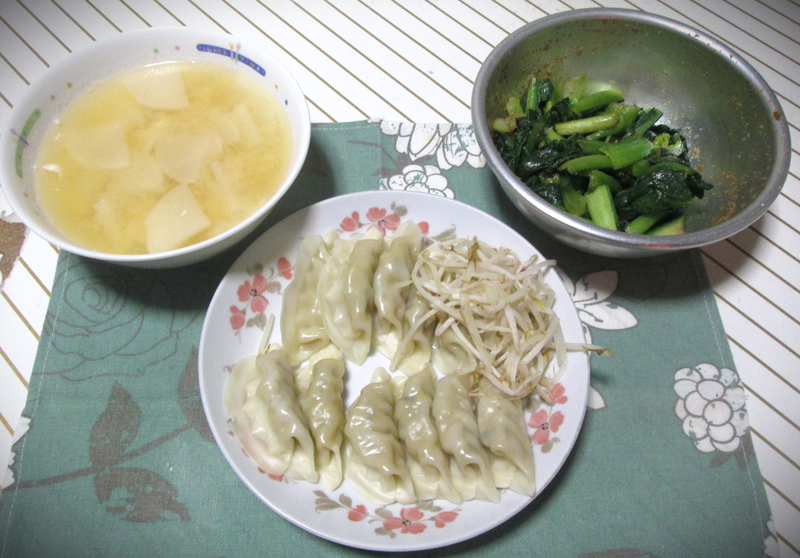 In the centre are discounted dumplings (149 yen, half price), simply steamed. I served them with bean sprouts (24 yen, half price) on the side.