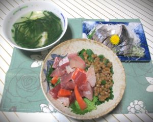 In the centre is a half-and-half rice bowl with assorted sashimi (199 yen, half price) and natto. I placed shiso leaves (98 yen) underneath.