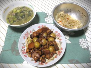 In the centre is a simmered dish made with discounted squid (250 yen, half price) and small, ping-pong-ball-sized potatoes (198 yen). I accidentally browned it a bit too much (^^;).