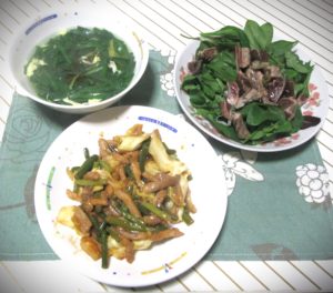 左は残っていたニラと卵で作ったニラ玉スープです。鶏ガラスープの素を使い、ラー油を加えてます。