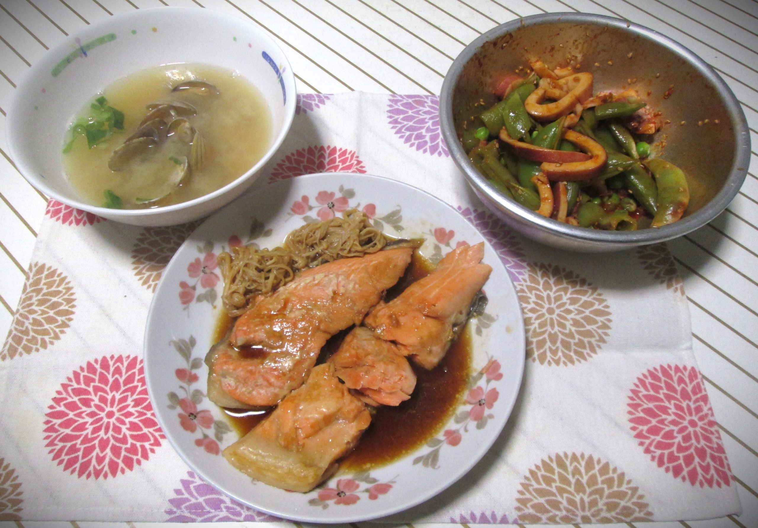In the centre is simmered coho salmon (305 yen, half price). I cooked it together with enoki mushrooms (98 yen).