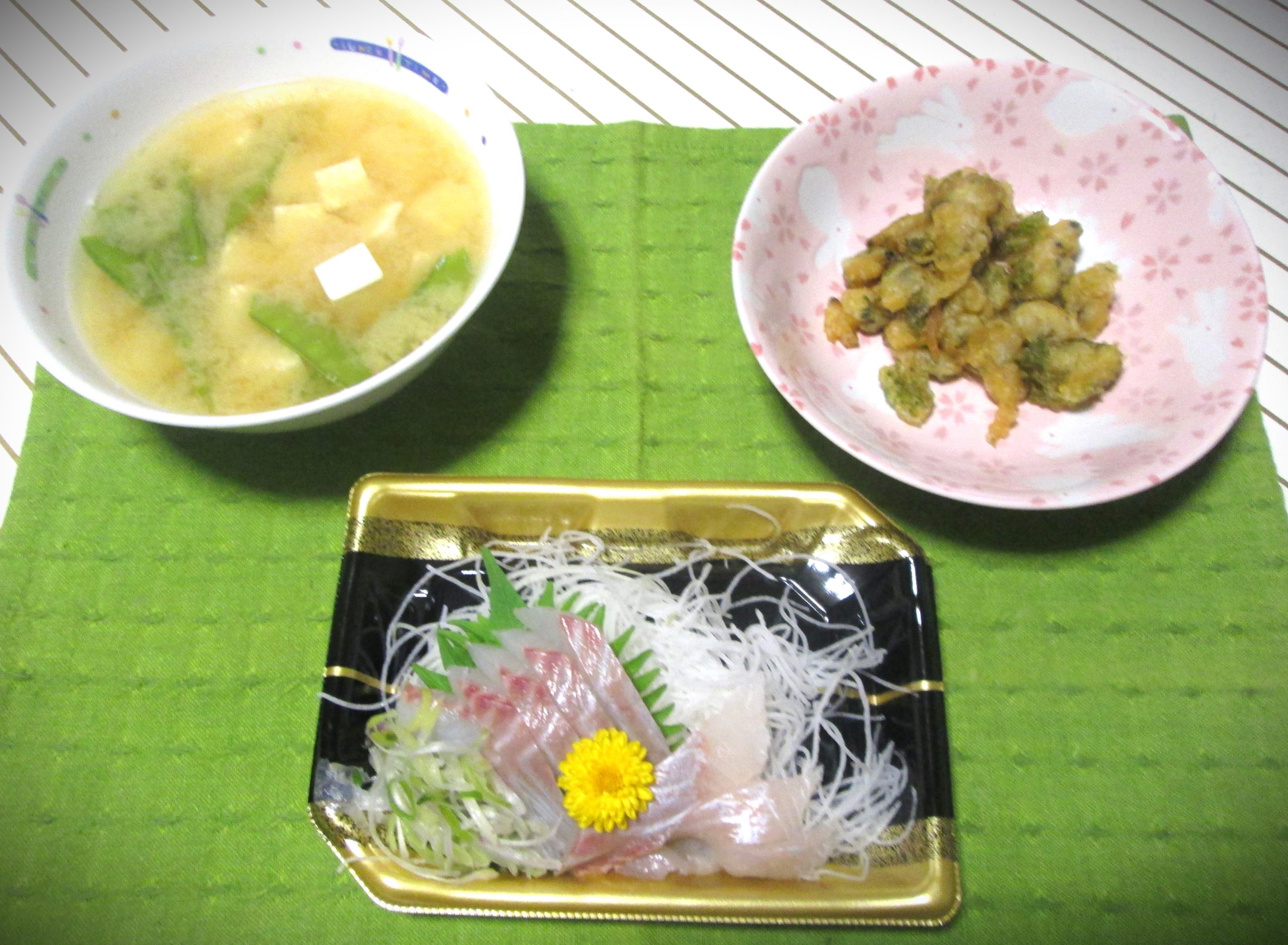 左は残っていた豆腐と絹さや(151円)の味噌汁です。