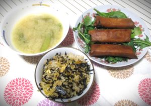 中は見切り品ひじき(114円/半額)の炊き込みご飯です。冷凍庫にあった刻み揚げとカットカボチャ(100円)を追加して、麺つゆで味付けしてます。