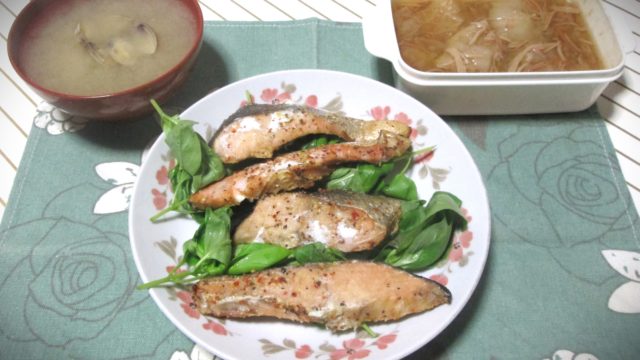 18日(日)の食卓から。左は見切り品あさり(149円/半額)の味噌汁です。中は実家で貰った冷凍秋鮭のバター焼きです。下に見切り品バジル(180円/30%引き)を敷いてます。右は16日(金)の残りで、蕪とカニカマのあんかけです。本日のかかった...