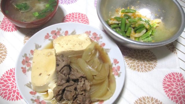 19日(月)の食卓から。左は昨日の残りで、あさりの味噌汁です。中は肉豆腐です。見切り品牛小間切れ肉(426円/20%引き)玉ねぎ(108円)エノキダケ(138円)木綿豆腐(58円)を使用しています。右はいか黄金(149円/半額)と見切り品い...