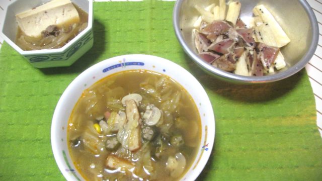 20日(火)の食卓から。左は昨日の残りで、肉豆腐です。牛小間切れ肉・玉ねぎ・エノキダケ・木綿豆腐が具材です。中は実家で貰った冷凍具材の入った坦々鶏団子スープです。にんにくをたっぷり入れて、おくら(98円)とマッシュルーム(98円)を追加し、...