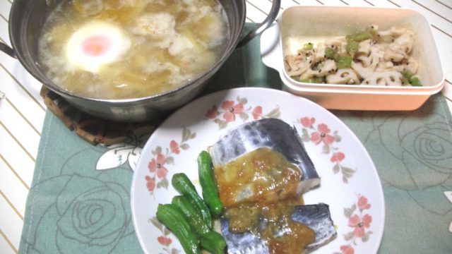 初回注文は50%OFFで実施中! 食材宅配サービスの『夕食ネット』♪24日(土)の食卓から。左は昨日の残りで、鶏ミンチボールの醤油スープです。白菜とエノキダケを入れてます。とろみをつけて卵を追加です。中は見切り品サゴシ(250円/半額)の味...